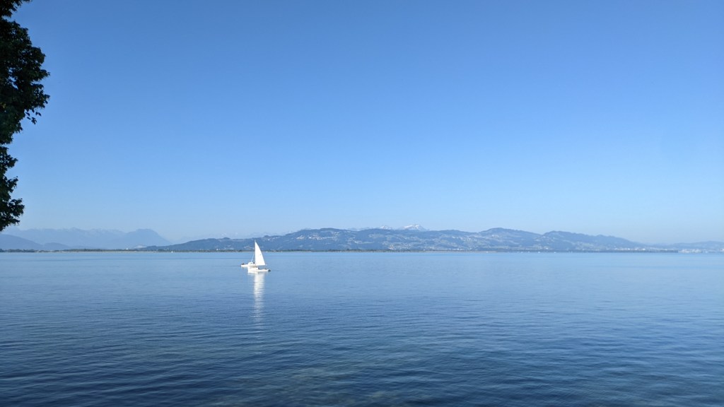 The lake was so big that it could almost be mistaken for a sea. The water in it looked so calm and collected, like it knew it belonged there. The blue hues were intermittently muddled with small white boats. Out there sailing! In the middle of the lake, a man and a young boy were paddle-boarding.